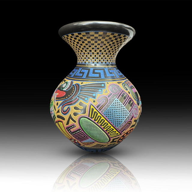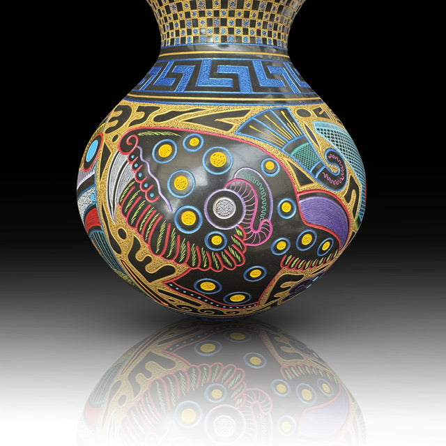 This sculptural vessel blends carved sea turtles, burnished Agua clay, and etched night-sky symbolism into a unified ocean-cosmic narrative. Each turtle is hand-carved in dimensional relief, creating depth, shadow, and movement against the glowing blue-green surface. Above, celestial etching evokes ancestral navigation and sky-watching traditions, framed by geometric border patterns inspired by Indigenous design.