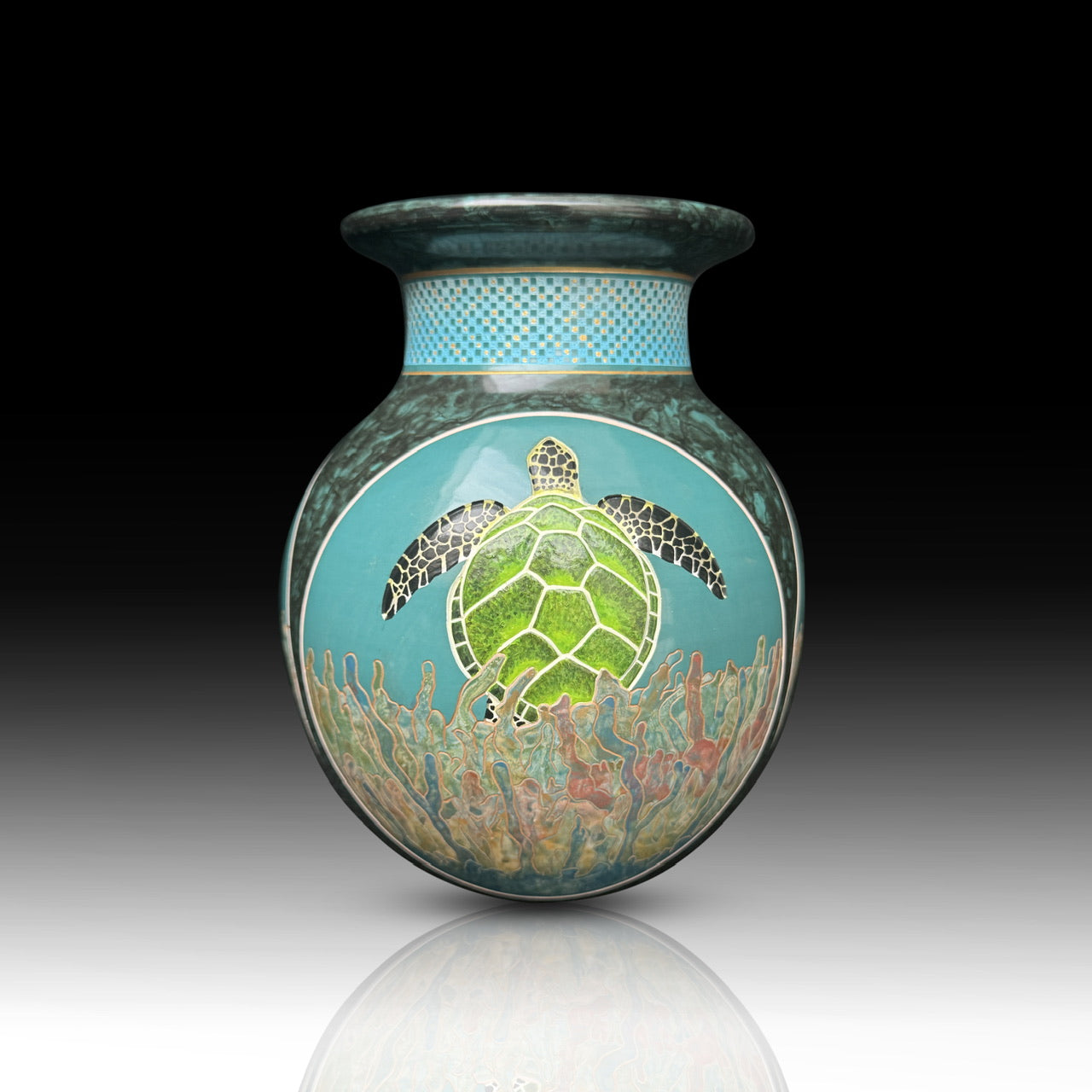An Illusion on this sculpture is that the turtle and reef windows feature just fired color whereas the native, tight etching is filled with high test metallic color.